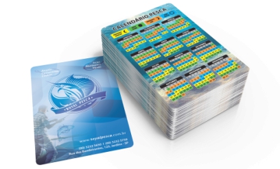 O Calendário de Pesca é um modelo especial de Calendário de Bolso. Neste produto é possível encontrar as indicações da lua para a melhor época de pesca: Crescente Regular, Cheia Ótima, Minguante Boa e Nova Neutra. Todos os períodos tem uma cor própria no calendário, tornando a identificação da melhor lua para a pesca algo rápido e eficiente.