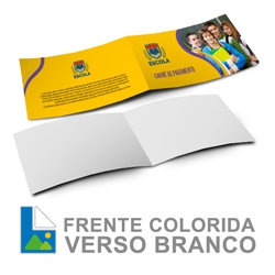 Aqui você pode imprimir capa de carnê em papel couchê ou em papel cartão. A capa de carne serve para prender os boletos de mensalidades de uma determinada instituição. O formato base de um boleto de cobrança é 10x21cm ou 9x20cm por isso as capas de carnê tem o formato aberto 10x42cm e fechado 10x21cm. A capa de carnê pode receber impressão na parte externa, 4/0, e também na parte interna, 4/4. Como opcional temos a opção de capa de carnê com janela, para que o seu cliente possa identificar o proprietário do carnê sem ter que abrir a cartela.