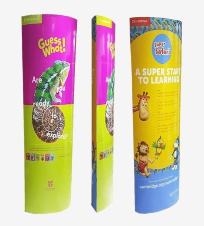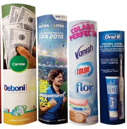 Totem Dobrável Elípticos  são versáteis e de fácil manuseio, produzidos em papelão podendo ser aplicado de diversas maneiras para destacar a sua marca no PDV, como por exemplo: Feiras, Eventos, Comunicação Corporativa, Farmácias e etc.
